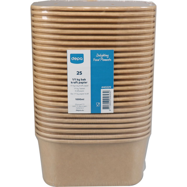 Op zoek naar de ideale kilobak? Deze fraaie Depa-kilobakken zijn gemaakt van kraftpapier, een hip en eigentijds ogend materiaal dat stevig aanvoelt. De bakken zijn zowel diepvriesbestendig als magnetronbestendig. Om dienst te kunnen doen als menubak is de binnenzijde van elk bakje voorzien van een vetafstotende en watervaste PP-coating. Met hun naturel kleurstelling zijn ze perfect voor festivals en evenementen en passen ze bij iedere cateraar, snackbar, foodtruck, toko en andere leverancier van bezorg- en afhaalmaaltijden.